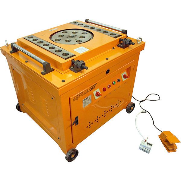 Гибочный станок для арматуры с режимом автоматической работы, в котором поворот планшайбы на заданный угол и возврат в исходное положение осуществляется однократным нажатием на педаль. Такой режим очень удобен при долговременной гибке на постоянный угол, так как сводит к минимуму погрешность угла гибки, а также значительно экономит время работы. Устройство защитного отключения входит в комплект поставки.