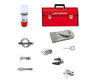 В наборе (72936): чемодан ПВХ (55016), разъединительный ключ 16 мм (72100), крюкообразная насадка 16 мм (72162), грушевидная насадка 16 мм (72163), гладкий вильчатый скребок 16 мм (72164), пикообразный скребок 16/25 мм (72169), крестообразная зубчатая насадка 16/45 мм (72177), цепная насадка 16 мм с 2 гладкими цепями (72185), рукавица левая (72120), спрэй ROWONAL (72142)